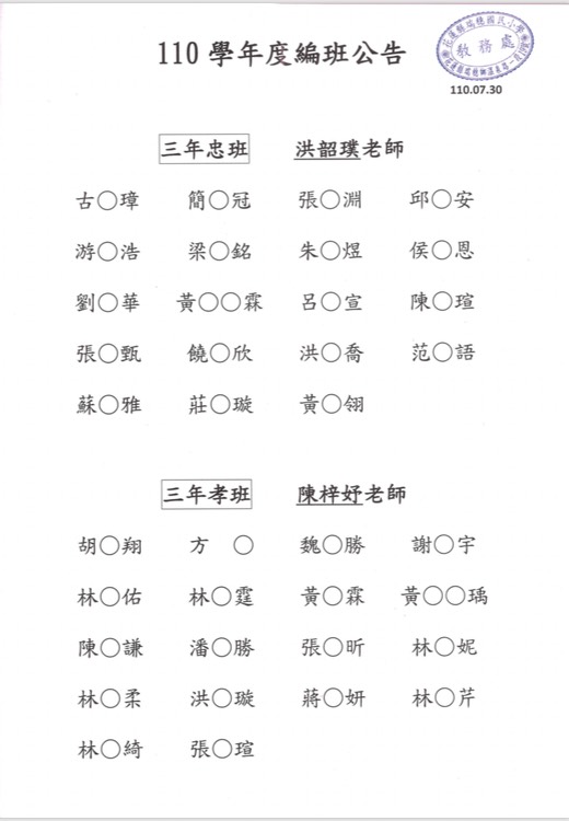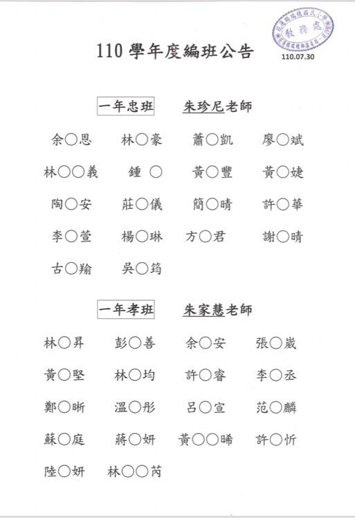 今天在全校老師返校會議中,已完成一、三、五年級公開抽班,編班公告中有孩子們的班級、導師、和同學姓名。